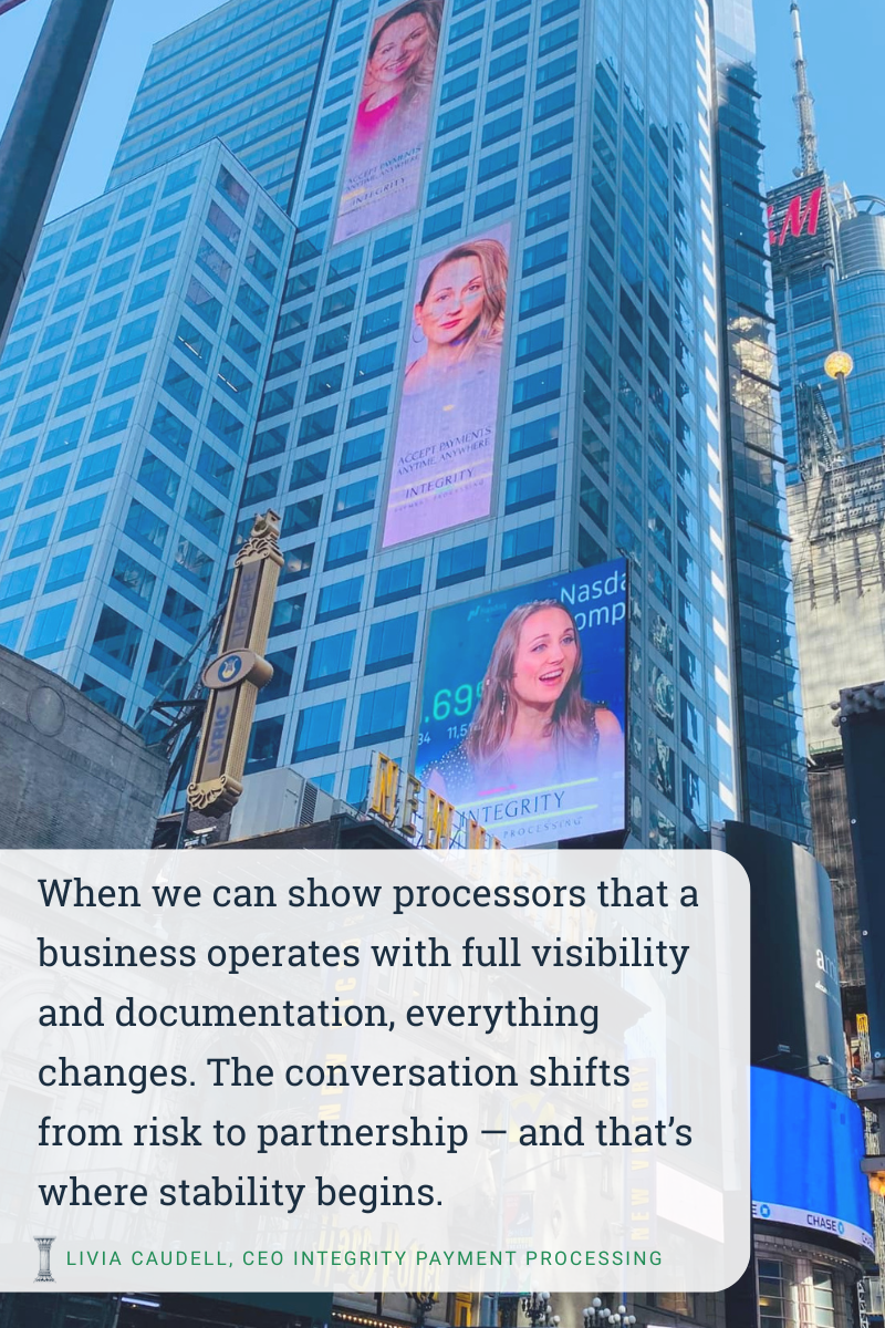 “Most shutdowns don’t happen because someone did something wrong — they happen because banks don’t understand what they’re seeing. That’s why education and transparency are everything in this industry.” – Livia Caudell, CEO, Integrity Payment Processing